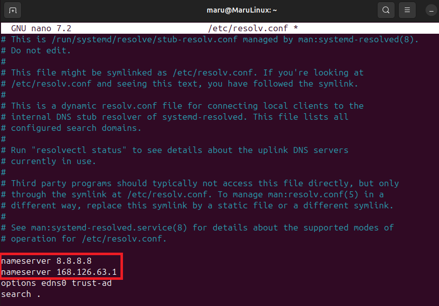 sudo nano /etc/resolv.conf 명령어를 입력하여 아래 내용을 설정해주고 저장한다.