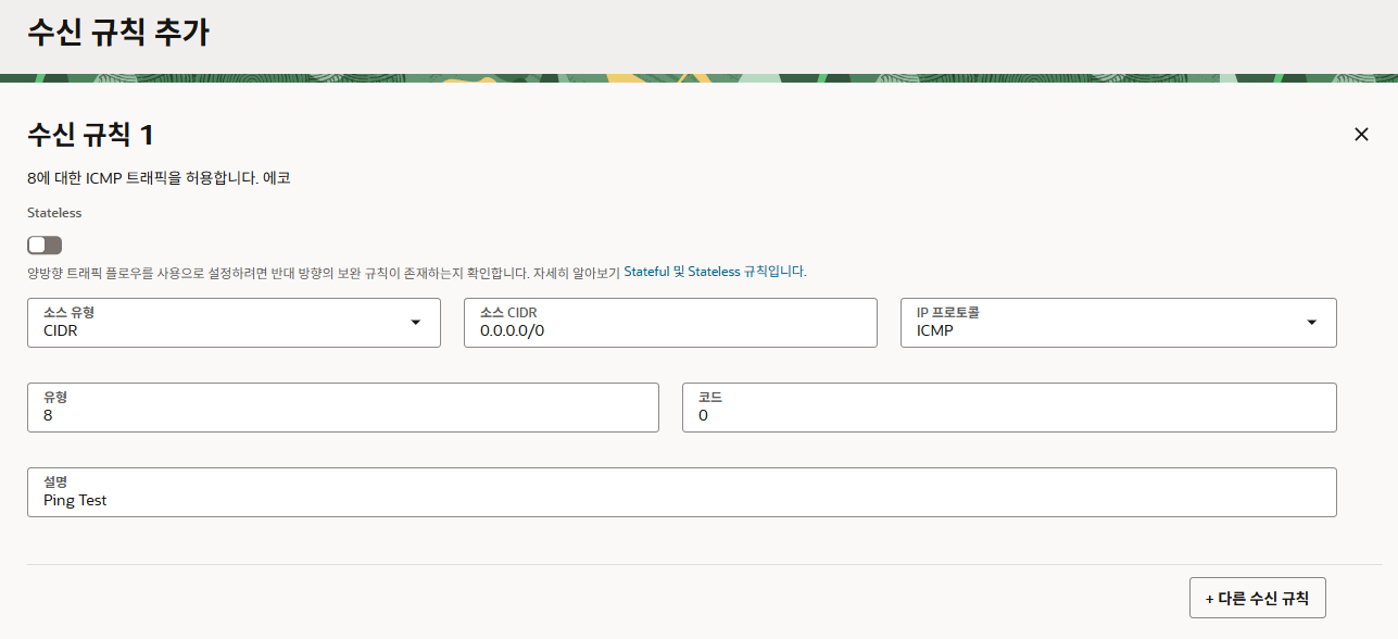 하나의 예시로, 인스턴스 서버 설정 후 외부에서 ping 응답을 받아보려면 ICMP 인바운드 규칙을 설정해야 하는데,