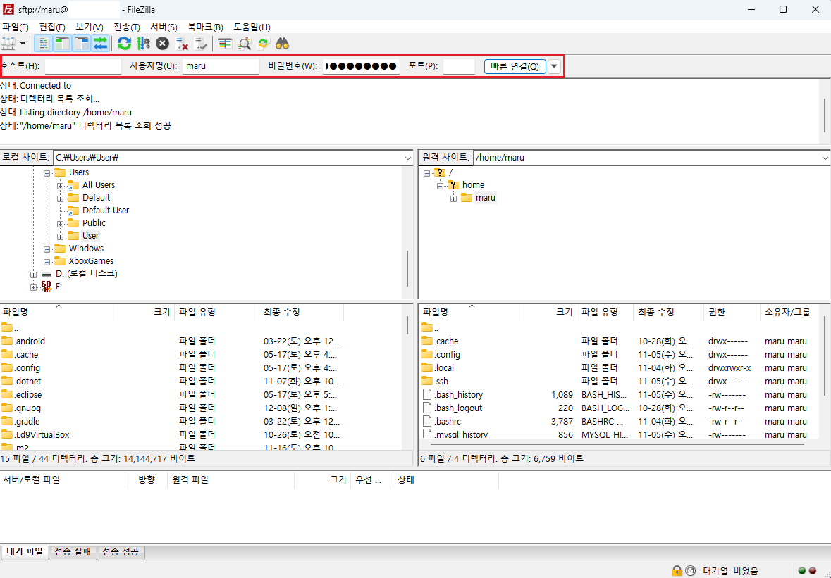 호스트에 퍼블릭 IP, 사용자명과 비밀번호를 넣고 포트는 22를 입력 후 빠른 연결을 클릭한다.